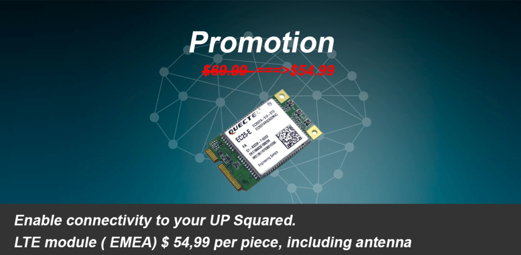 UP shop starts promotion of Quectel LTE module ( EC25-E). Limited quantities available, come and get it. Compatible with UP Squared boards, UP Squared Edge gateway and any boards with m-PCIe expansion.