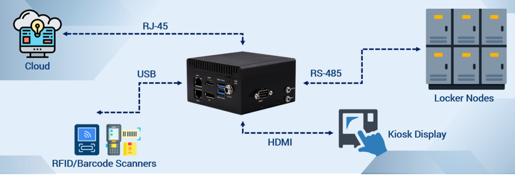 The key thing that set the UP Squared 7100 Edge apart from other choices was its multifaceted and broad selection of interfaces, especially given its small size. The customer’s existing smart locker infrastructure relied on RS-485 serial communication via COM port, and so the task of controlling the application’s locker hardware leveraged the UP Squared 7100 Edge’s dual COM ports. Via its RS-485 interface, the UP Squared 7100 Edge was able to support up to 32 locker nodes connected in daisy-chain topology. This allowed users to enter a code for a specific locker, at which point the  UP Squared 7100 Edge could send the necessary command for the locker associated with that node to be unlocked, while also receiving confirmation that it had been closed, via the sensor installed in each locker.