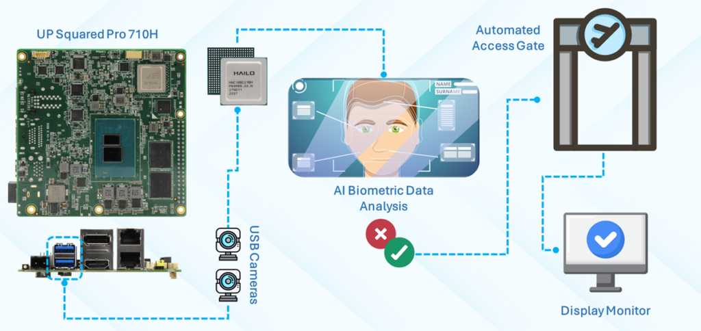 Boasting up to 26 TOPs along with market-leading power-efficiency, the UP Squared Pro 710H’s integrated Hailo-8™ edge AI accelerator was perfectly suited to the application’s mission, as it meant that once the client’s algorithm had been trained for the rapid prototyping of biometric algorithms using machine learning frameworks such as TensorFlow and PyTorch, it could be optimized and painlessly deployed with the chip’s native Hailo TAPPAS SDK. As we know, nobody likes having to transfer, so a direct flight from model training to execution was a welcome addition.