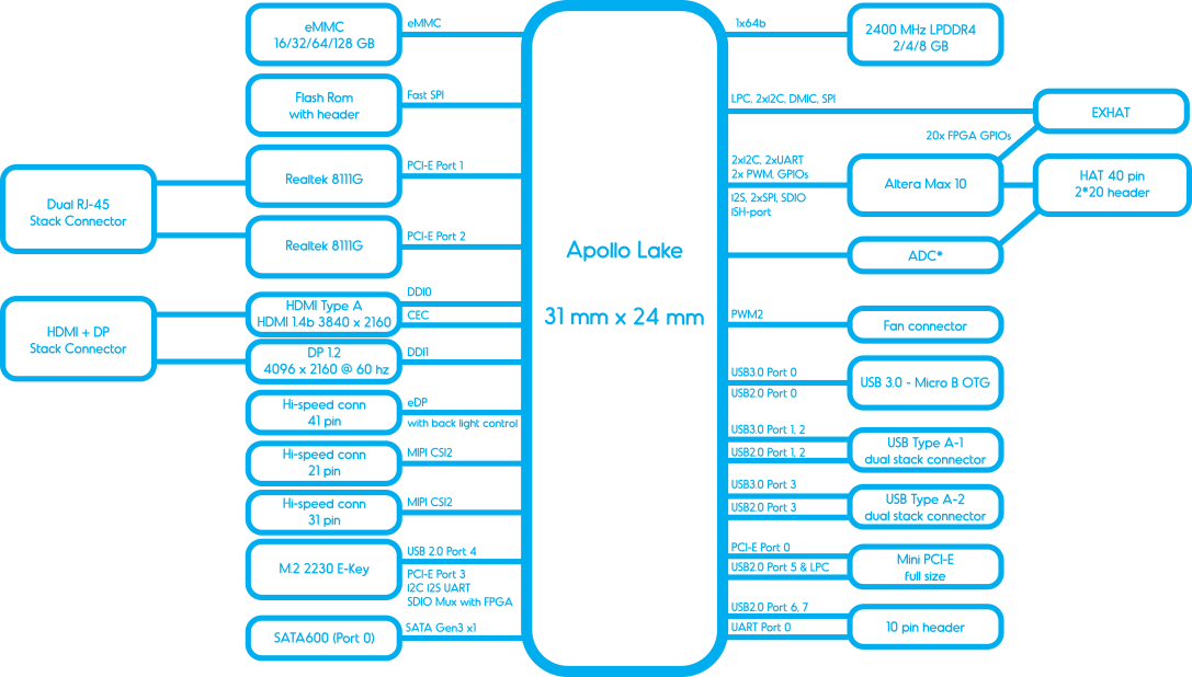 | SoC | Intel® Celeron™ N3350 (up to 2.4 GHz) Intel® Pentium™ N4200 (up to 2.5 GHz) Intel® Atom ™ x5-E3940 (up to 1.8Ghz) Intel® Atom ™ x7-E3950 (up to 2.0Ghz) |